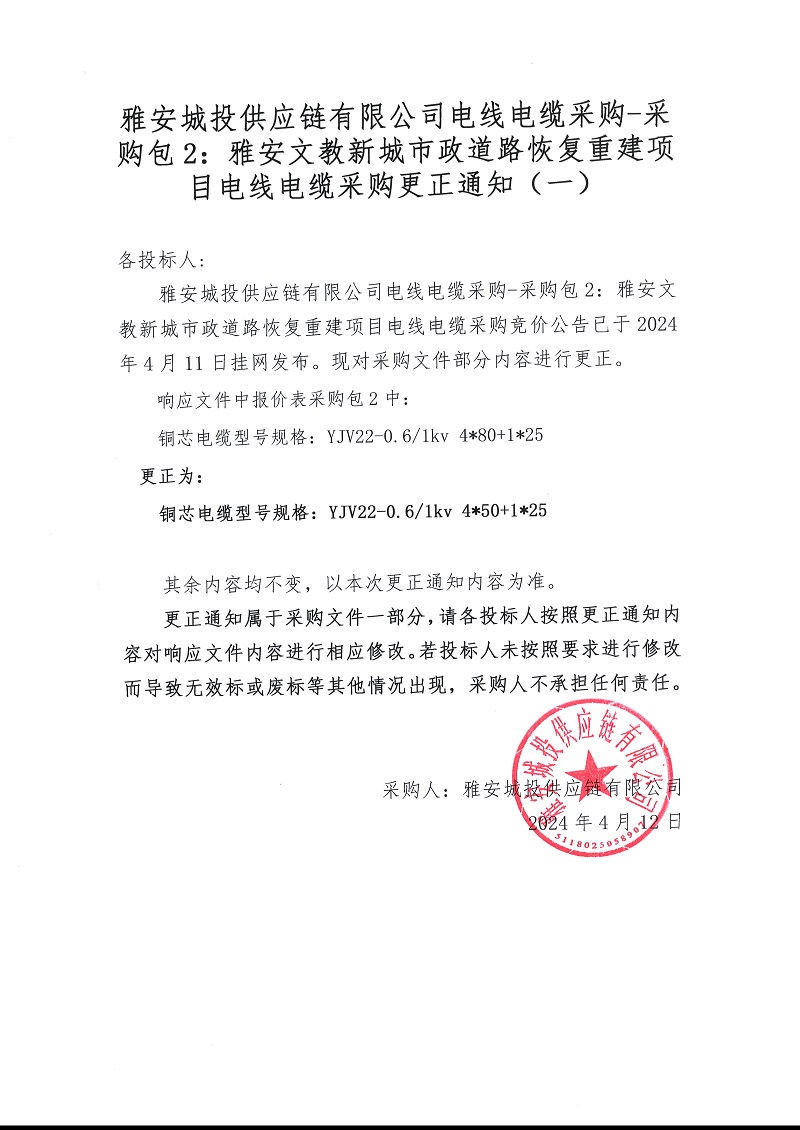 雅安城投供應(yīng)鏈有限公司電線電纜采購(gòu)-采購(gòu)包2:雅安文教新城市政道路恢復(fù)重建項(xiàng)目電線電纜采購(gòu)更正通知(一)