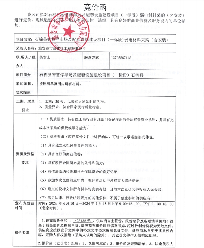 石棉縣智慧停車場(chǎng)及配套設(shè)施建設(shè)項(xiàng)目(一標(biāo)段)弱電材料采購(含安裝)競(jìng)價(jià)公告