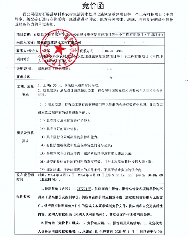 石棉縣草科鄉(xiāng)農(nóng)村生活污水處理設施恢復重建項目等十個工程打捆項目(王崗坪鄉(xiāng))級配碎石競價公告