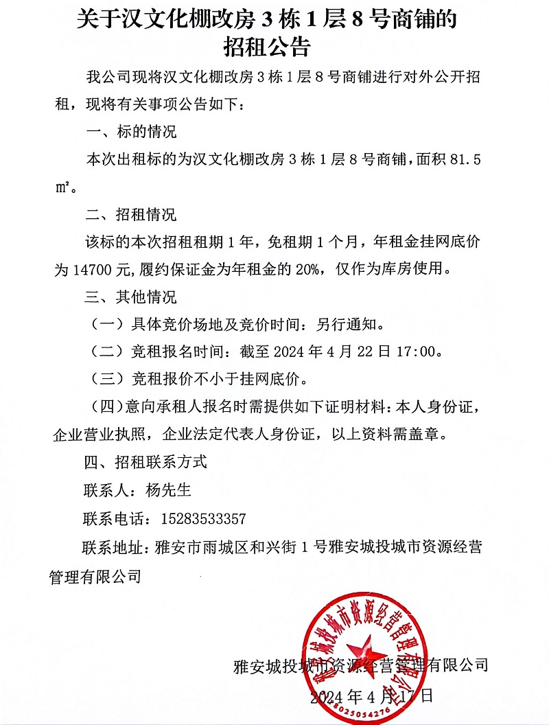 關(guān)于漢文化棚改房3棟1層8號商鋪的招租公告