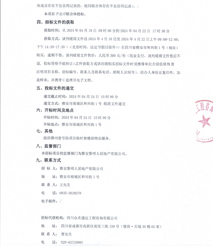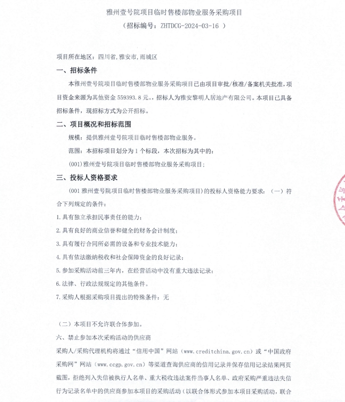 雅州壹號院項目臨時售樓部物業(yè)服務(wù)采購項目公告