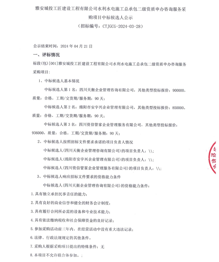 雅安城投工匠建設工程有限公司水利水電施工總承包二級資質申辦咨詢服務采購項目中標候選人公示