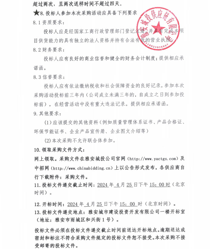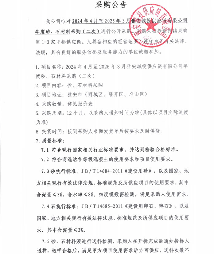 2024年4月至2025年3月雅安城投供應鏈有限公司年度砂、石材料采購(第二次)公告