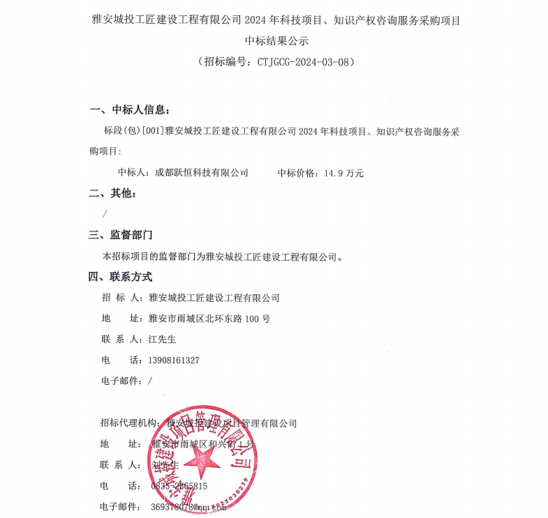 雅安城投工匠建設(shè)工程有限公司2024年科技項(xiàng)目、知識(shí)產(chǎn)權(quán)咨詢服務(wù)采購項(xiàng)目中標(biāo)結(jié)果公示