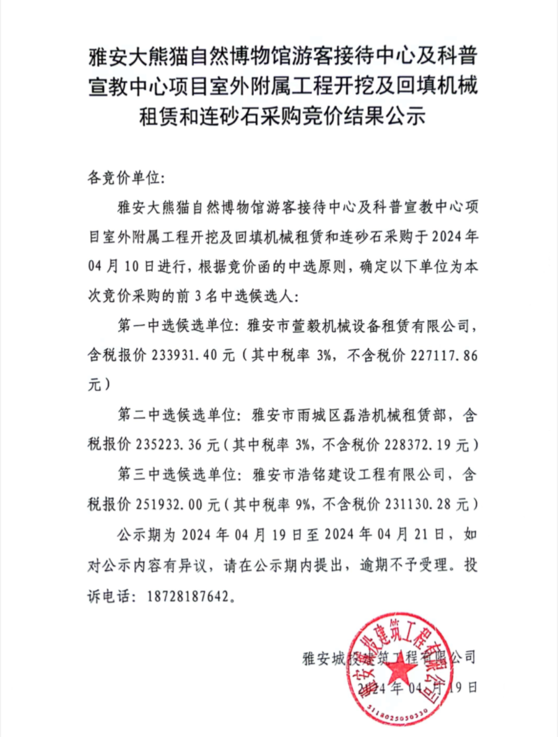 雅安大熊貓自然博物館游客接待中心及科普宣教中心項(xiàng)目室外附屬工程開挖及回填機(jī)械租賃和連砂石采購競價(jià)結(jié)果公示