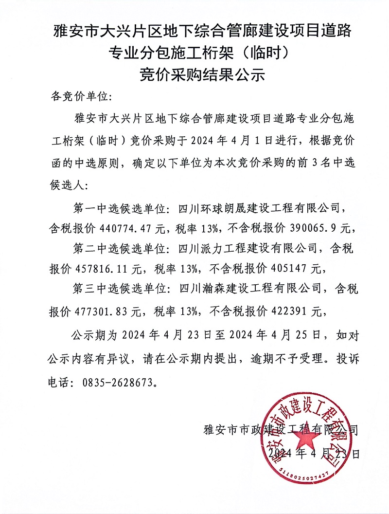 雅安市大興片區(qū)地下綜合管廊建設(shè)項(xiàng)目道路專業(yè)分包施工桁架(臨時(shí))競(jìng)價(jià)采購(gòu)結(jié)果公示