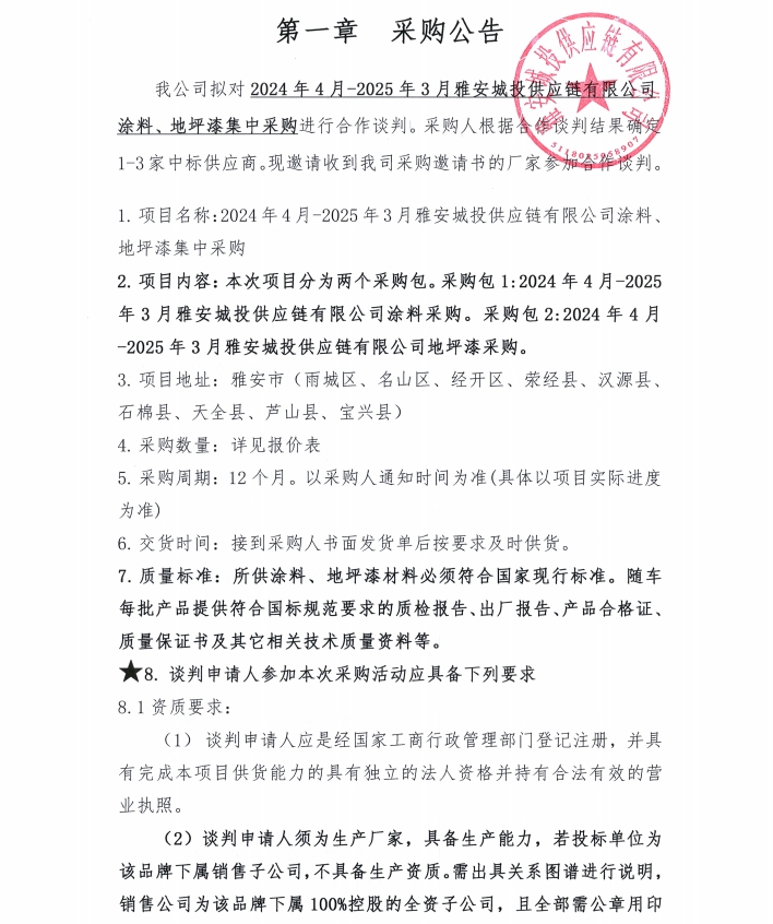2024年4月-2025年3月雅安城投供應(yīng)鏈有限公司涂料、地坪漆集中采購(gòu)公告