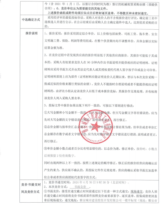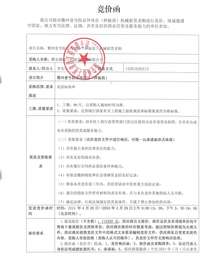 雅州壹號院總坪項目(樣板段)機(jī)械租賃采購競價公告