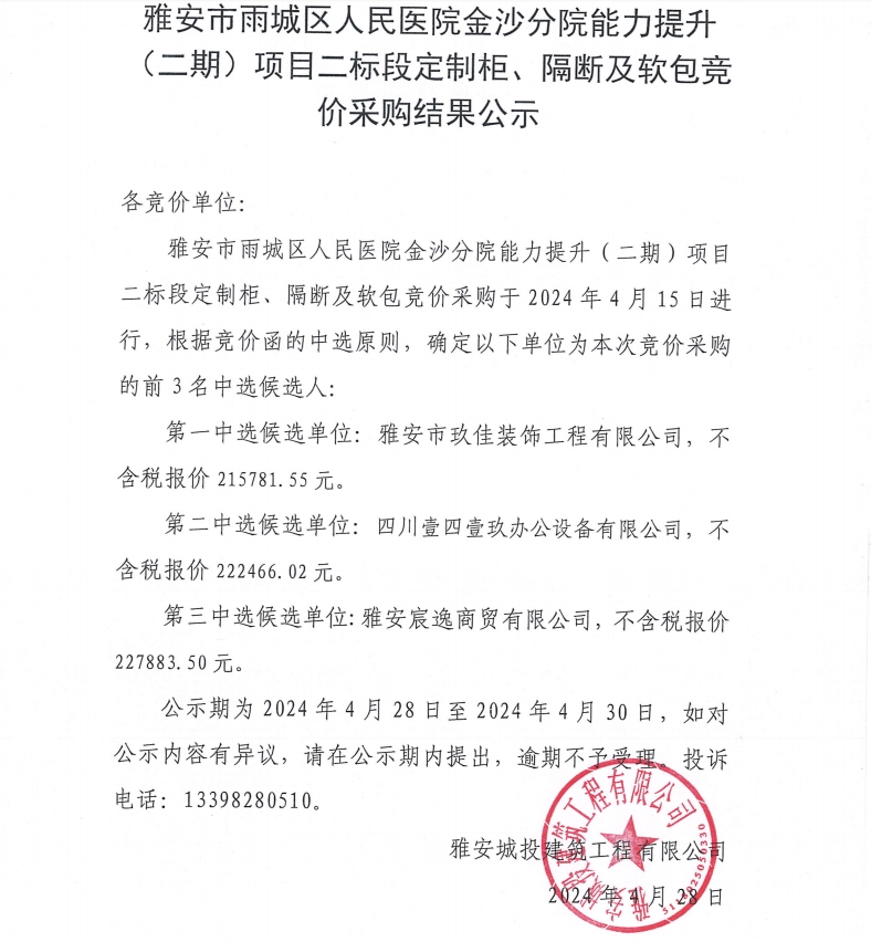 雅安市雨城區(qū)人民醫(yī)院金沙分院能力提升(二期)項目二標(biāo)段定制柜、隔斷及軟包競價采購結(jié)果公示