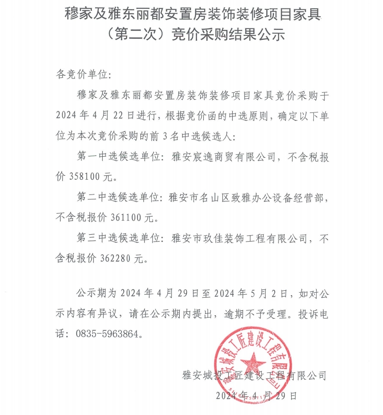 穆家及雅東麗都安置房裝飾裝修項(xiàng)目家具(第二次)競價(jià)采購結(jié)果公示