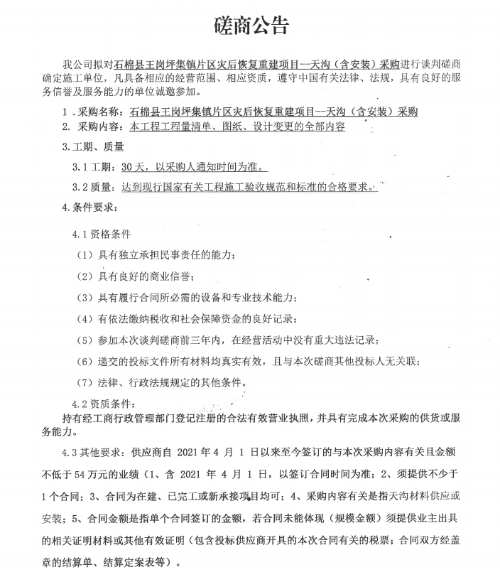 石棉縣王崗坪集鎮(zhèn)片區(qū)災(zāi)后恢復(fù)重建項(xiàng)目--天溝(含安裝)采購談判磋商公告