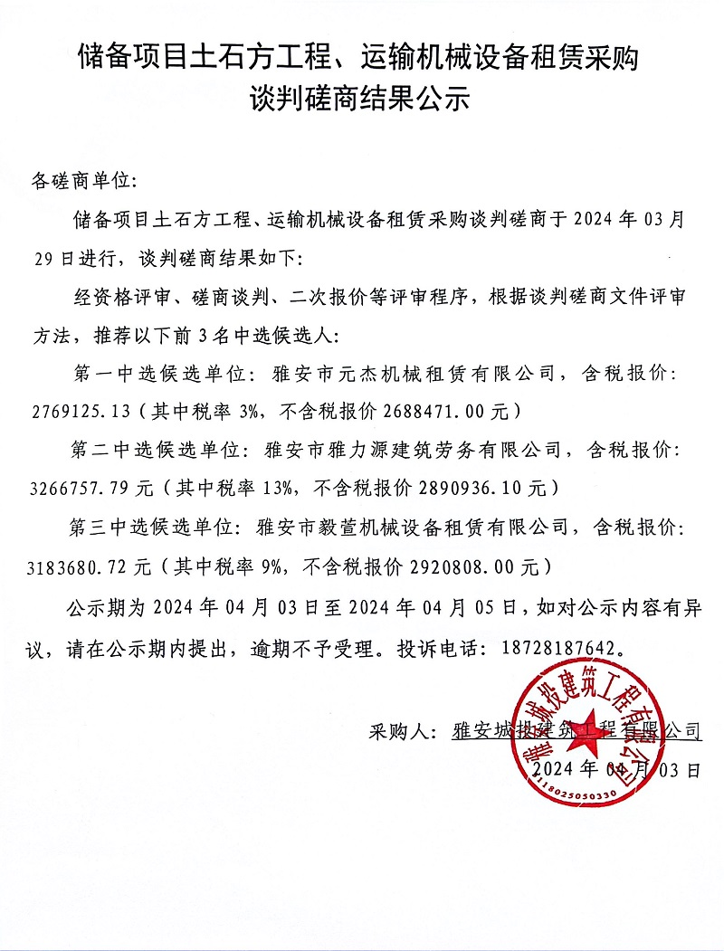 儲備項目土石方工程、運輸機(jī)械設(shè)備租賃采購談判磋商結(jié)果公示