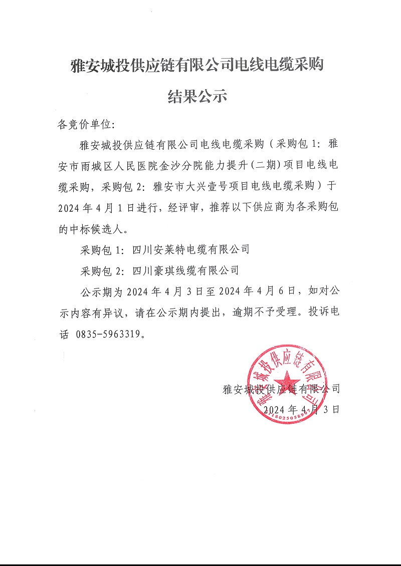 雅安城投供應鏈有限公司電線電纜采購結(jié)果公示