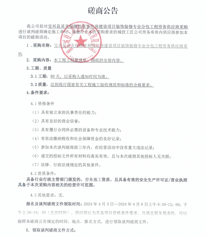 寶興縣靈關(guān)保障性租賃住房建設(shè)項(xiàng)目裝飾裝修專(zhuān)業(yè)分包工程勞務(wù)供應(yīng)商采購(gòu)磋商公告