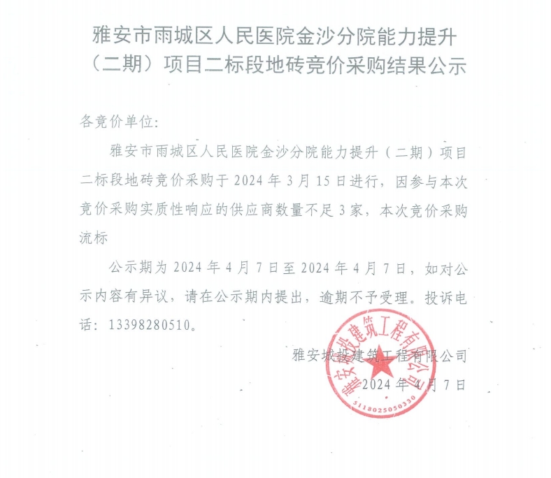 雅安市雨城區(qū)人民醫(yī)院金沙分院能力提升(二期)項(xiàng)目二標(biāo)段地磚競(jìng)價(jià)采購結(jié)果公示