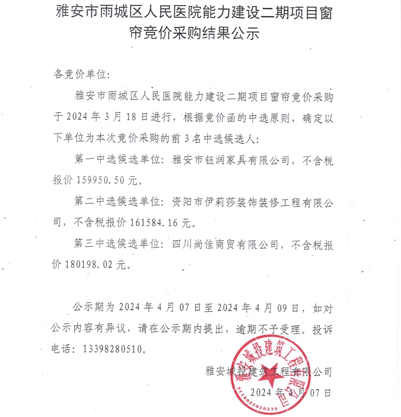 雅安市雨城區(qū)人民醫(yī)院能力建設(shè)二期項(xiàng)目窗簾競(jìng)價(jià)采購(gòu)結(jié)果公示