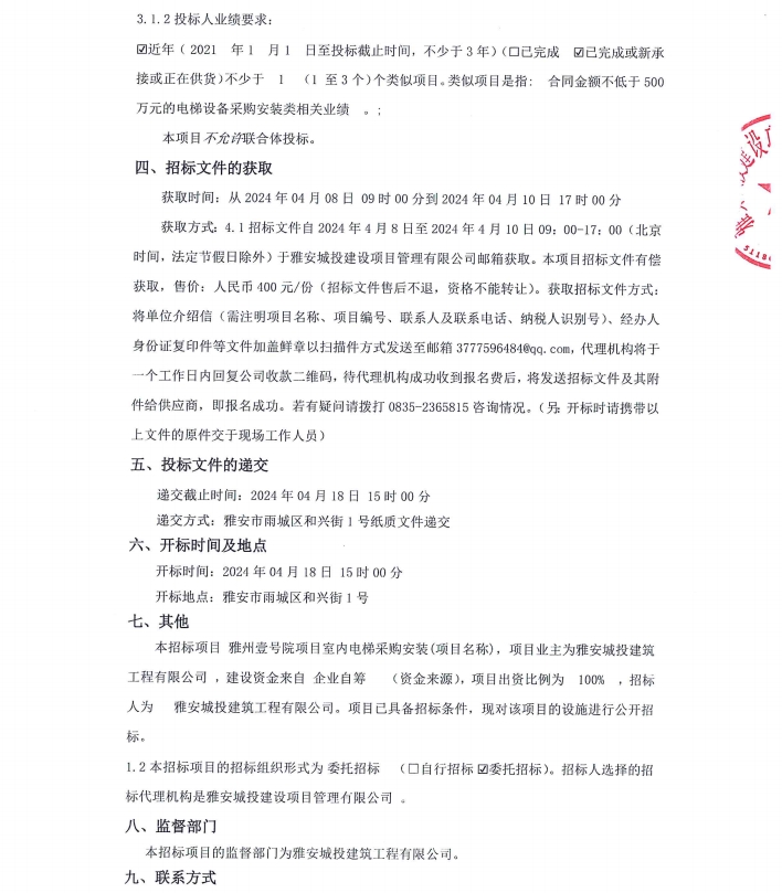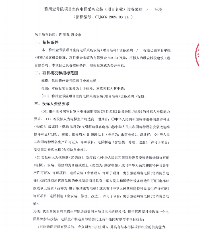 雅州壹號院項(xiàng)目室內(nèi)電梯采購安裝(項(xiàng)目名稱)設(shè)備采購/標(biāo)段公告