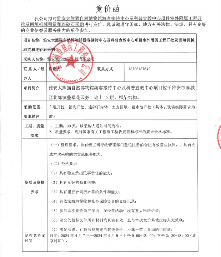 雅安大熊貓自然博物館游客接待中心及科普宣教中心項(xiàng)目室外附屬工程開挖及回填機(jī)械租賃和連砂石采購競價(jià)公告