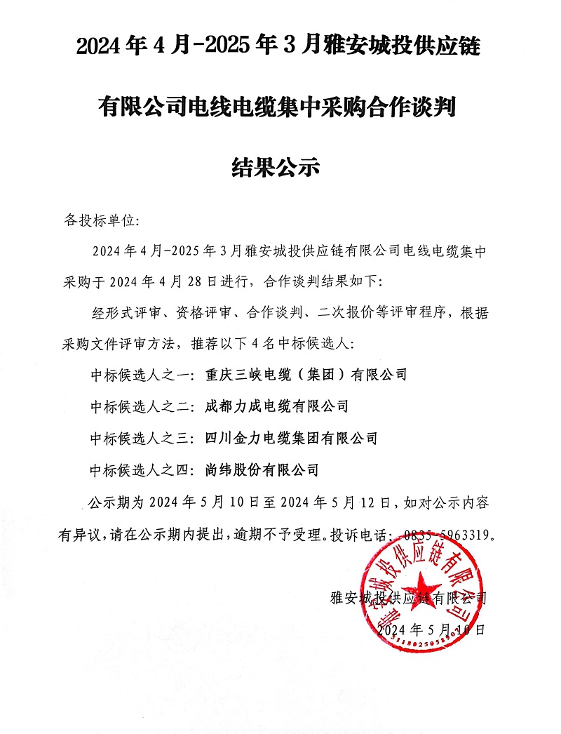 2024年4月-2025年3月雅安城投供應(yīng)鏈有限公司電線電纜集中采購合作談判結(jié)果公示