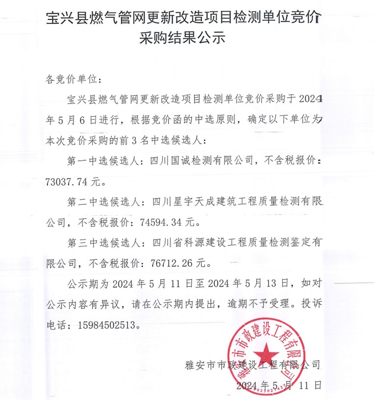 寶興縣燃?xì)夤芫W(wǎng)更新改造項(xiàng)目檢測單位競采購結(jié)果公示