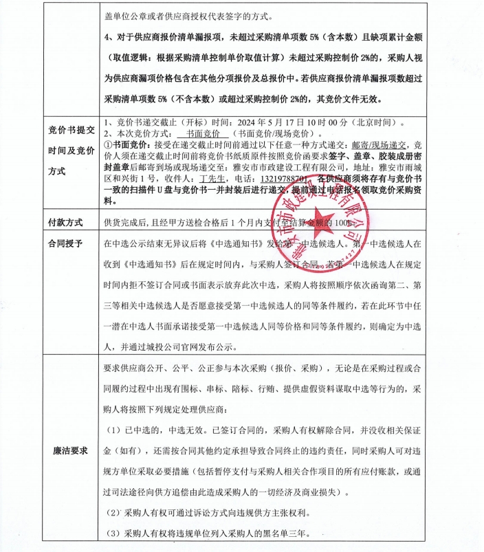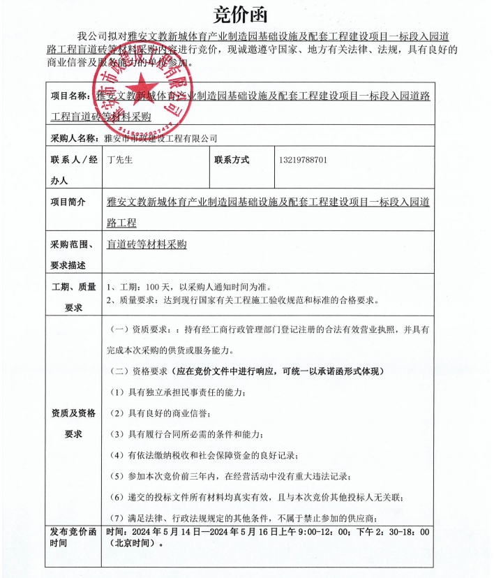 雅安文教新城體育產(chǎn)業(yè)制造園基礎(chǔ)設(shè)施及配套工程建設(shè)項(xiàng)目一標(biāo)段入園道路工程盲道磚等材料采購競價(jià)公告