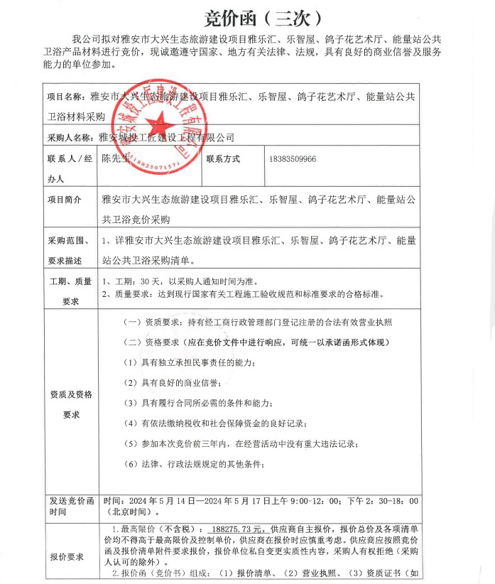 雅安市大興生態(tài)旅游建設項目雅樂匯、樂智屋、鴿子花藝術廳、能量站公共衛(wèi)浴材料采購(三次)競價公告