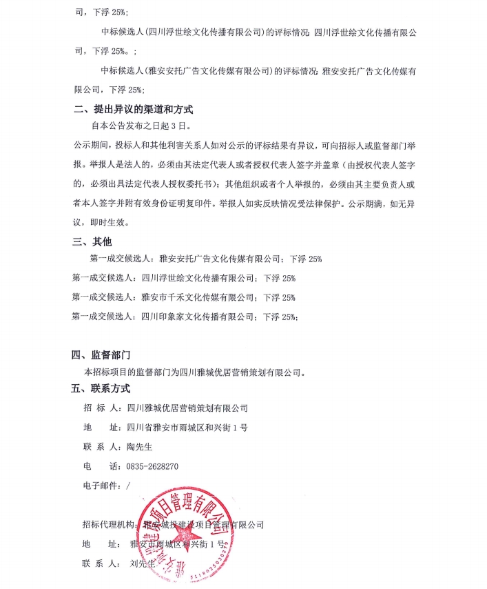 2024年四川雅城優(yōu)居營銷策劃有限公司年度廣告制作服務(wù)項目中標(biāo)候選人公示