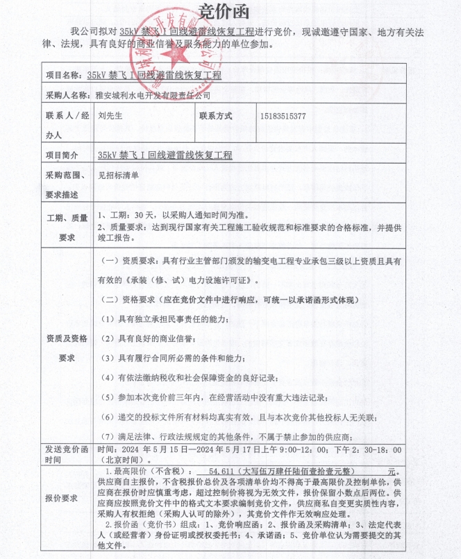 35kV禁飛I回線避雷線恢復(fù)工程競(jìng)價(jià)公告