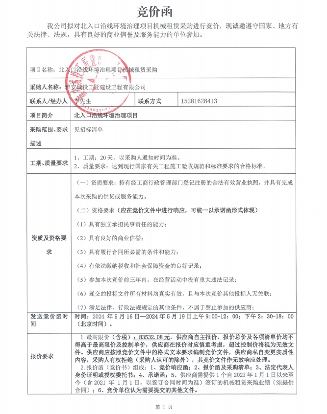 北入口沿線環(huán)境治理項(xiàng)目機(jī)械租賃采購(gòu)競(jìng)價(jià)公告