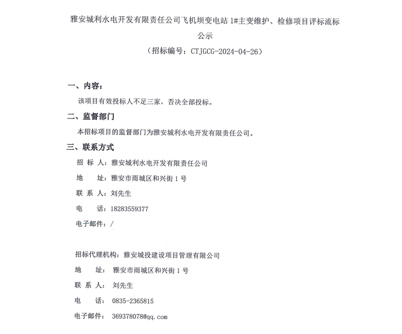 雅安城利水電開發(fā)有限責(zé)任公司飛機(jī)壩變電站1#主變維護(hù)、檢修項(xiàng)目評標(biāo)流標(biāo)公示