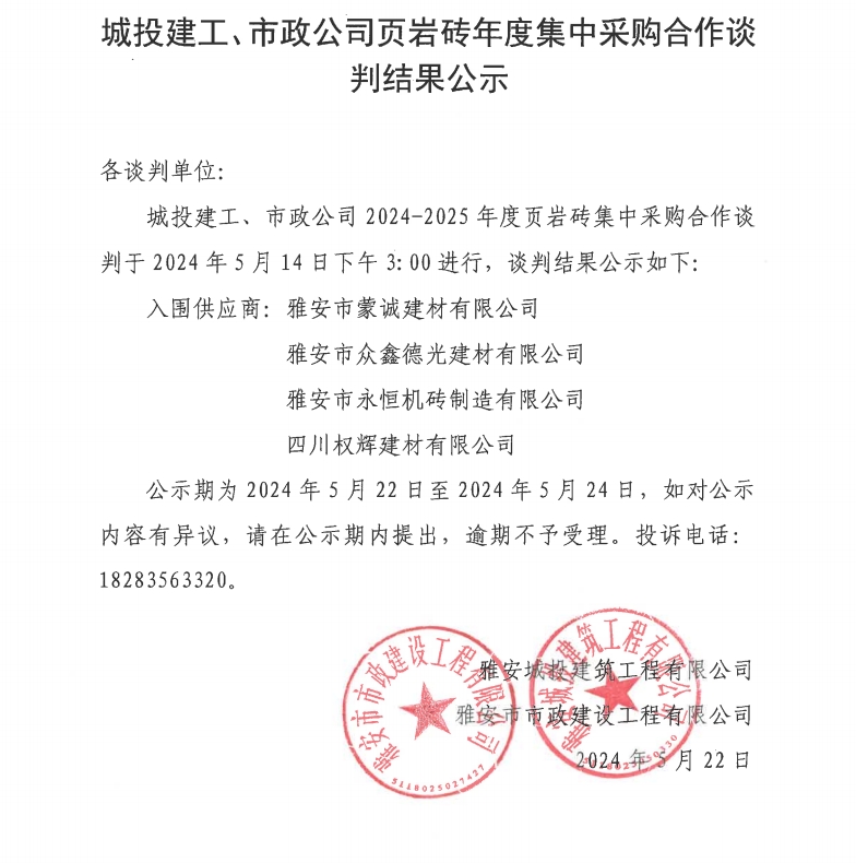城投建工、市政公司頁巖磚年度集中采購合作談判結(jié)果公示