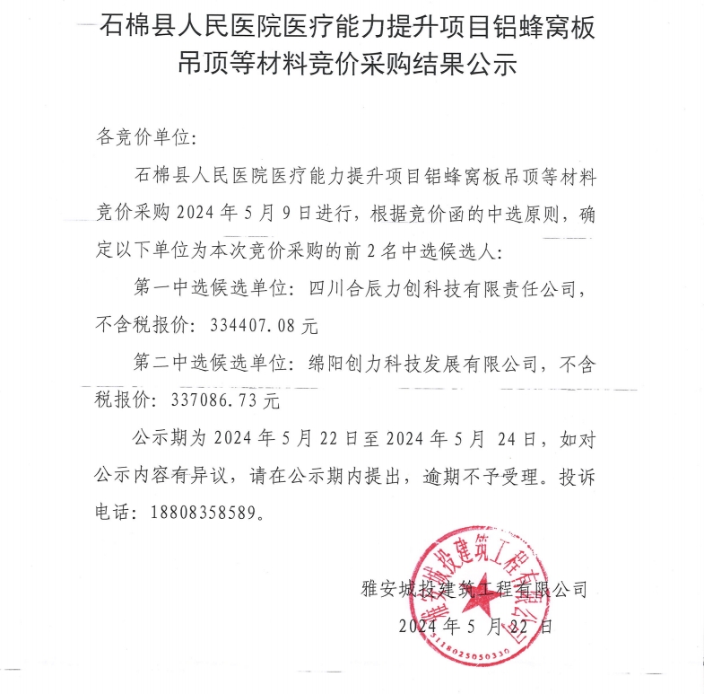 石棉縣人民醫(yī)院醫(yī)療能力提升項(xiàng)目鋁蜂窩板吊頂?shù)炔牧细們r(jià)采購結(jié)果公示