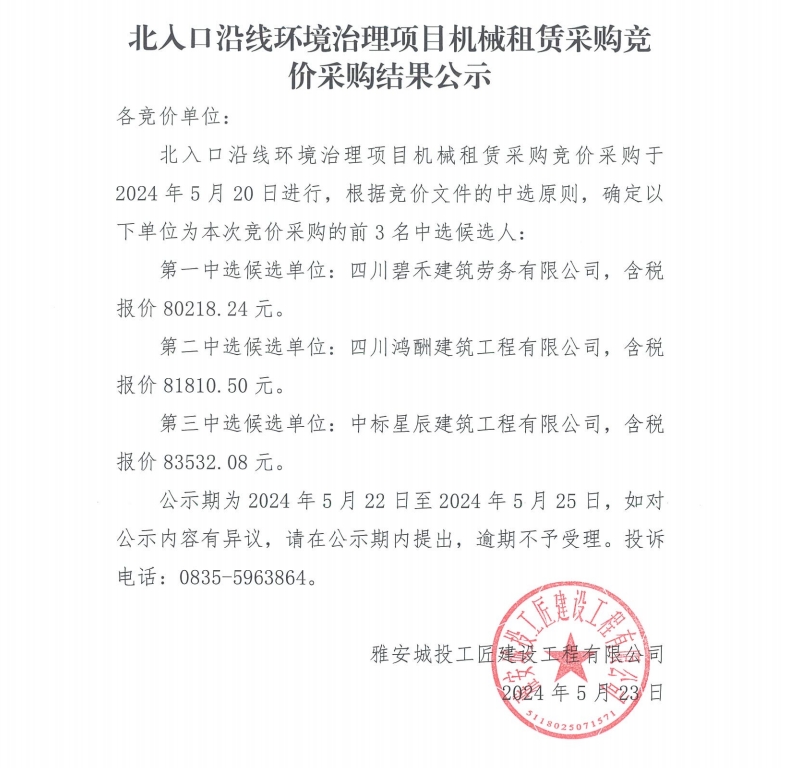 北入口沿線環(huán)境治理項(xiàng)目機(jī)械租賃采購競(jìng)價(jià)采購結(jié)果公示