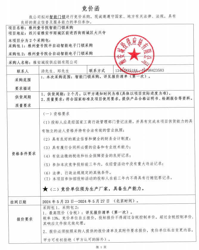 附件1:競(jìng)價(jià)函--雅州壹號(hào)院智能門(mén)鎖采購(gòu)