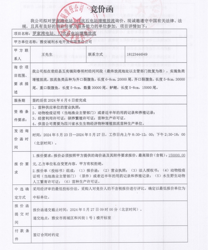羅家灣電站、門坎石電站增殖放流競價(jià)公告
