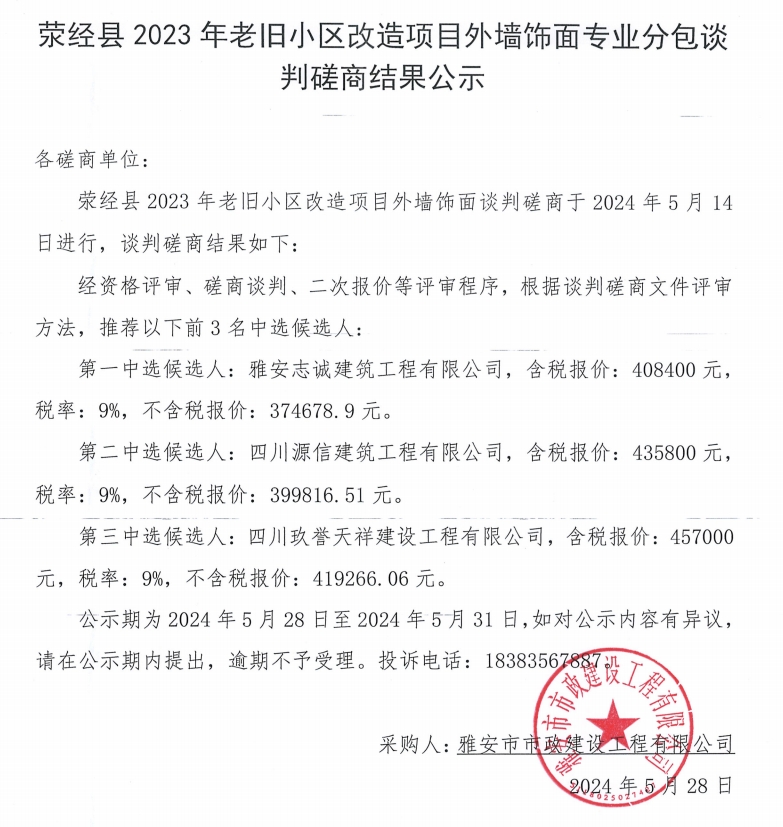 滎經(jīng)縣2023年老舊小區(qū)改造項(xiàng)目外墻飾面專(zhuān)業(yè)分包談判磋商結(jié)果公示