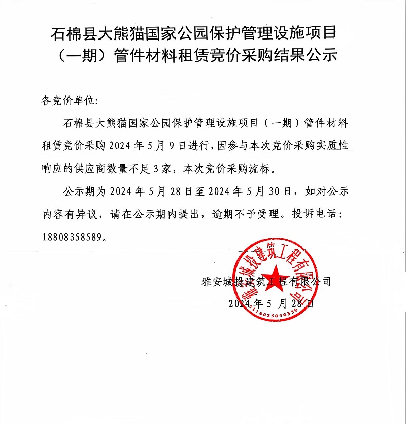 石棉縣大熊貓國家公園保護(hù)管理設(shè)施項(xiàng)目(一期)管件材料租賃競價(jià)采購結(jié)果公示