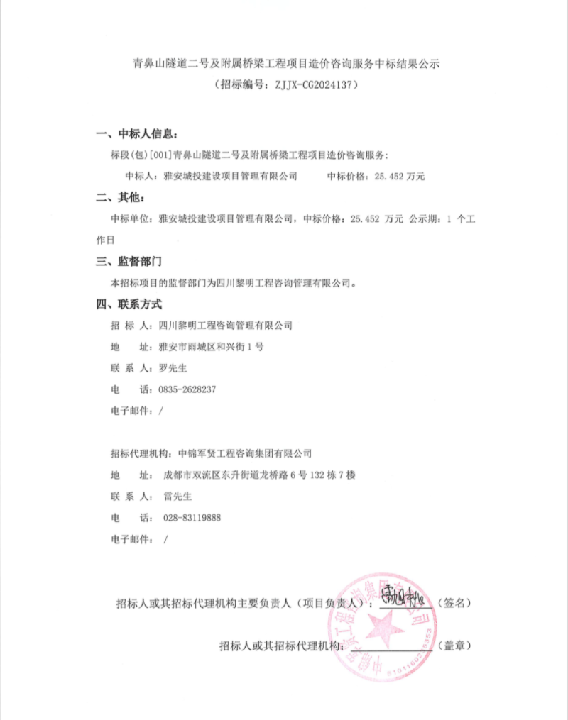 青鼻山隧道二號及附屬橋梁工程項目造價咨詢服務(wù)中標(biāo)結(jié)果公示