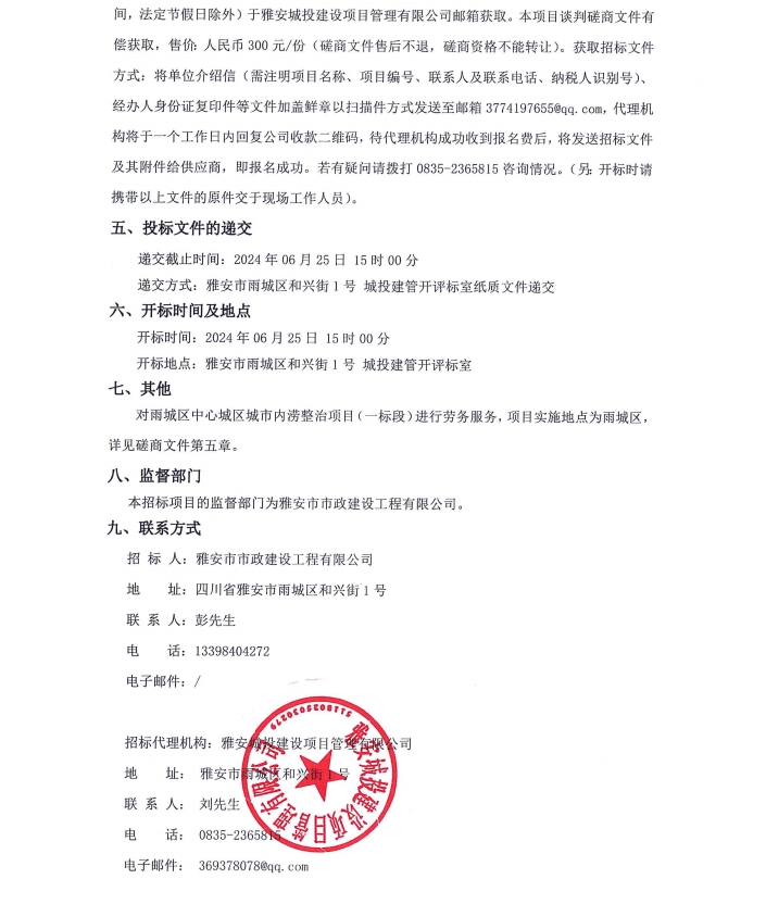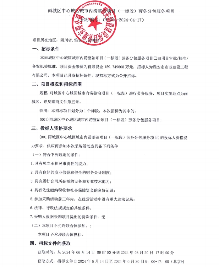 雨城區(qū)中心城區(qū)城市內(nèi)澇整治項目(一標段)勞務(wù)分包服務(wù)項目公告