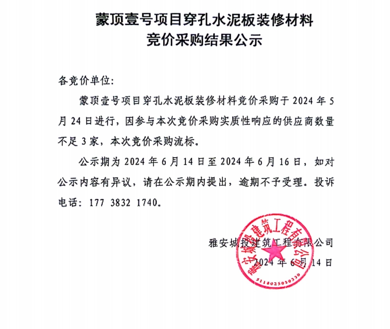 蒙頂壹號項目穿孔水泥板裝修材料競價采購結(jié)果公示