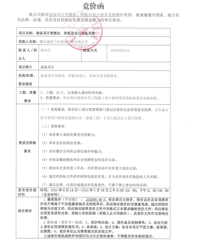 儲備項目售樓處、樣板房設計服務采購競價公告