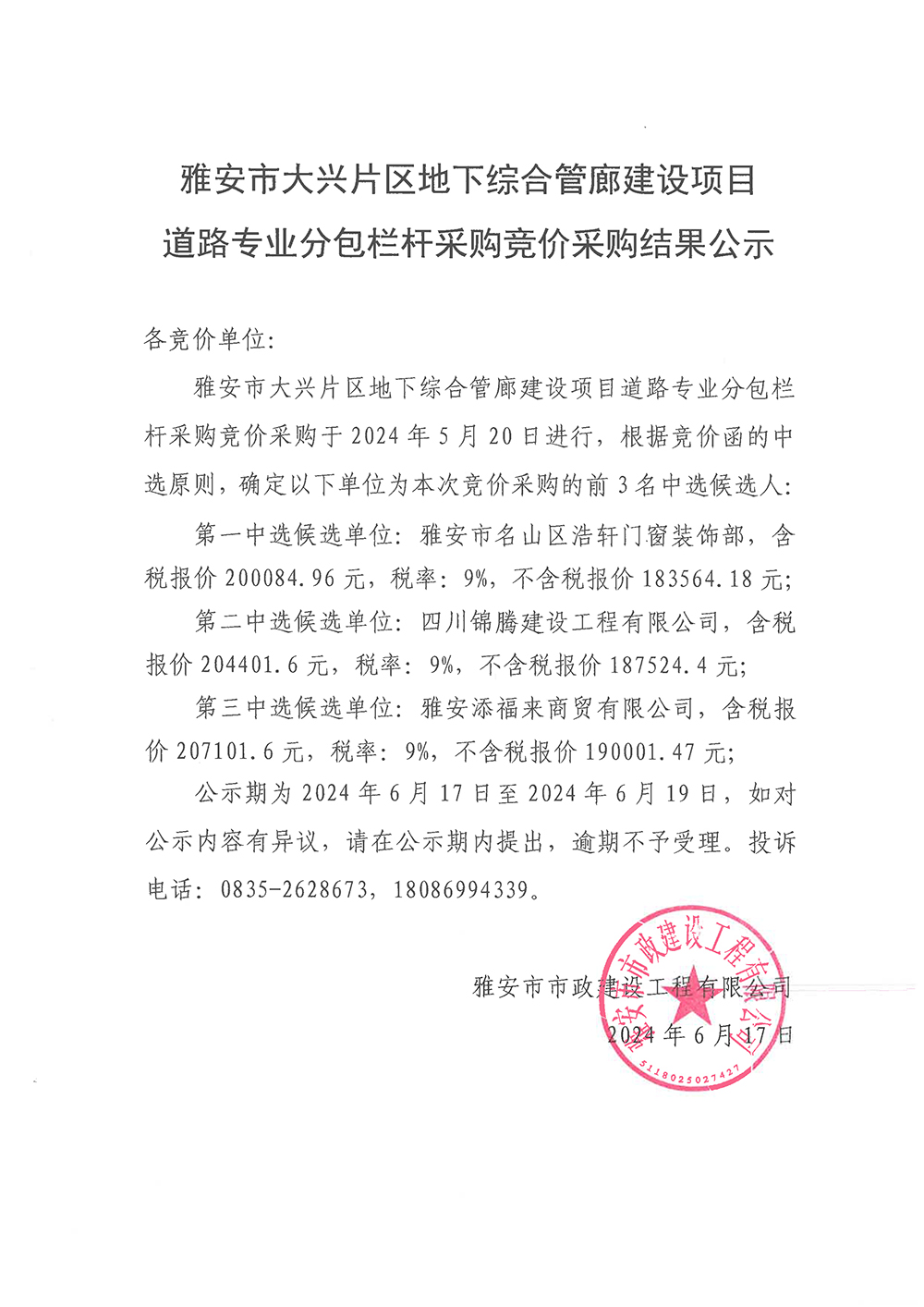雅安市大興片區(qū)地下綜合管廊建設(shè)項目道路專業(yè)分包欄桿采購競價采購結(jié)果公示