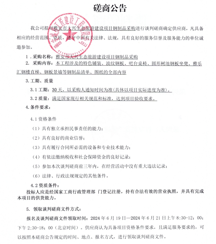 雅安市大興生態(tài)旅游建設(shè)項(xiàng)目鋼制品采購(gòu)談判磋商公告