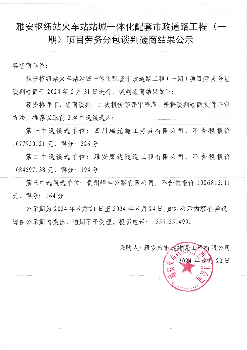 雅安樞紐站火車(chē)站站臺(tái)一體化配套市政道路工程(一期)項(xiàng)目勞務(wù)分包談判磋商結(jié)果公示