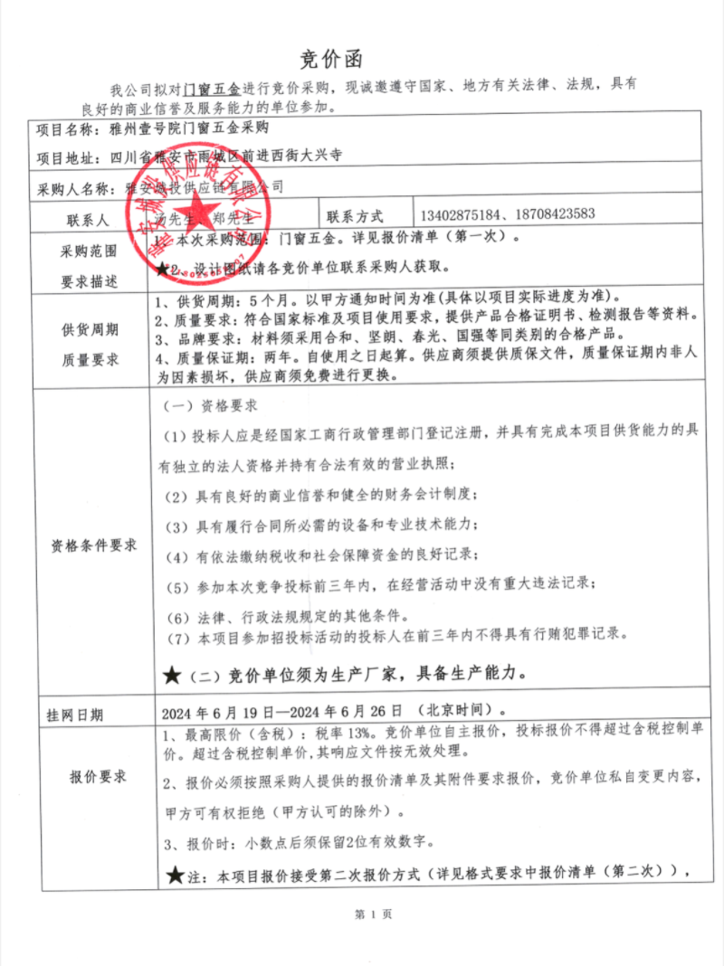 報價清單(第一次)-雅州壹號院門窗五金采購