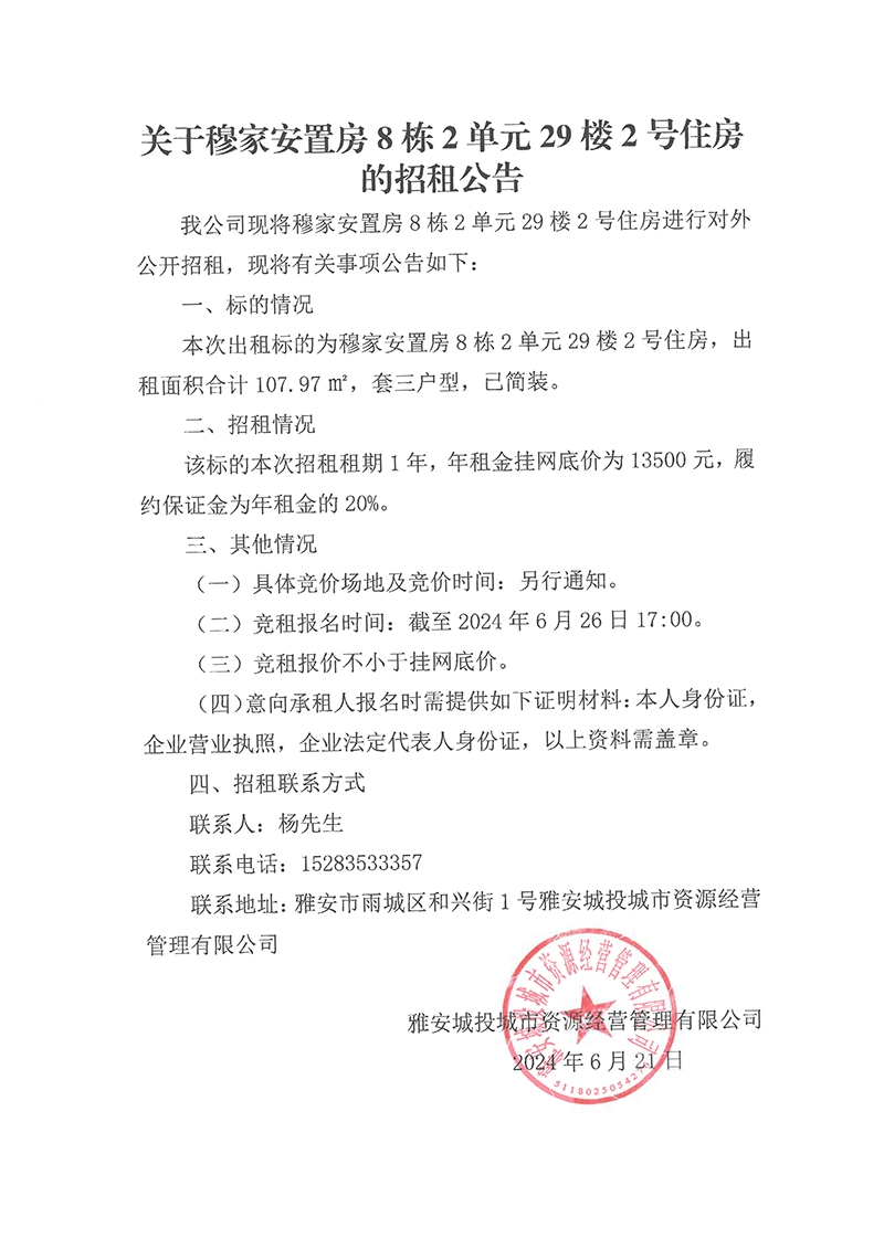 關于穆家安置房8棟2單元29樓2號住房的招租公告
