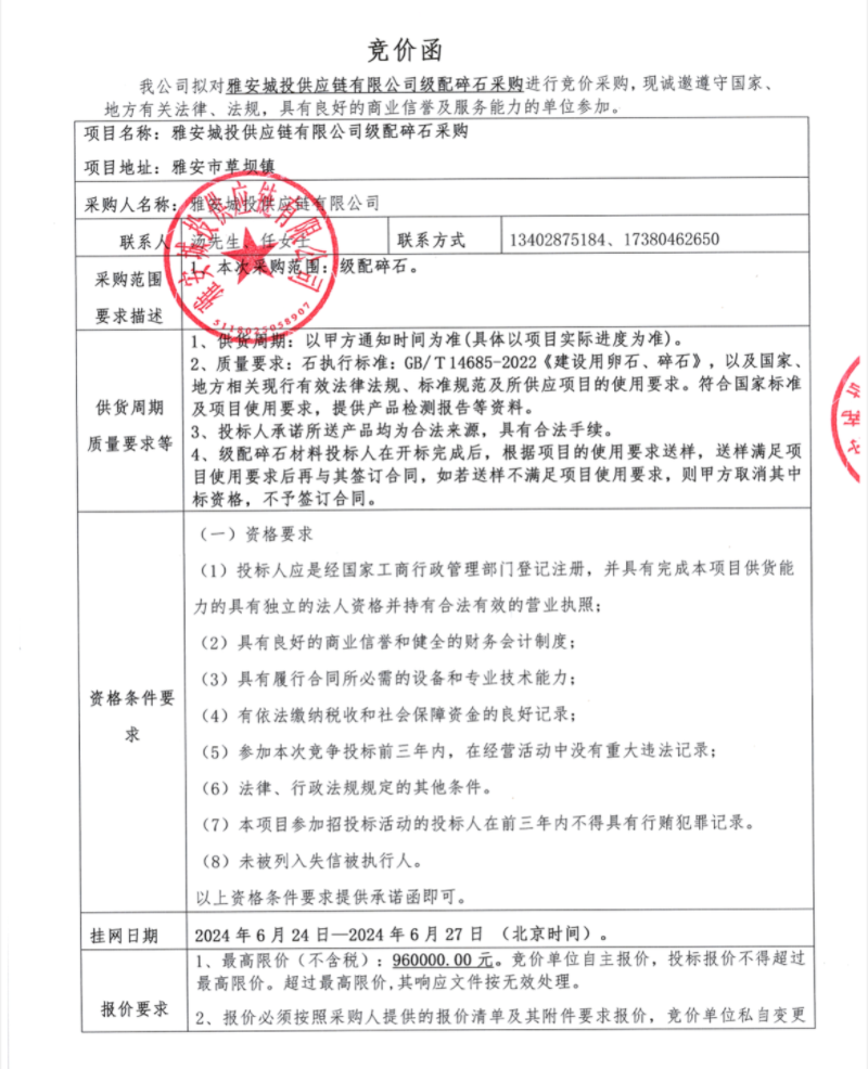 雅安城投供應(yīng)鏈有限公司級配碎石采購競價公告