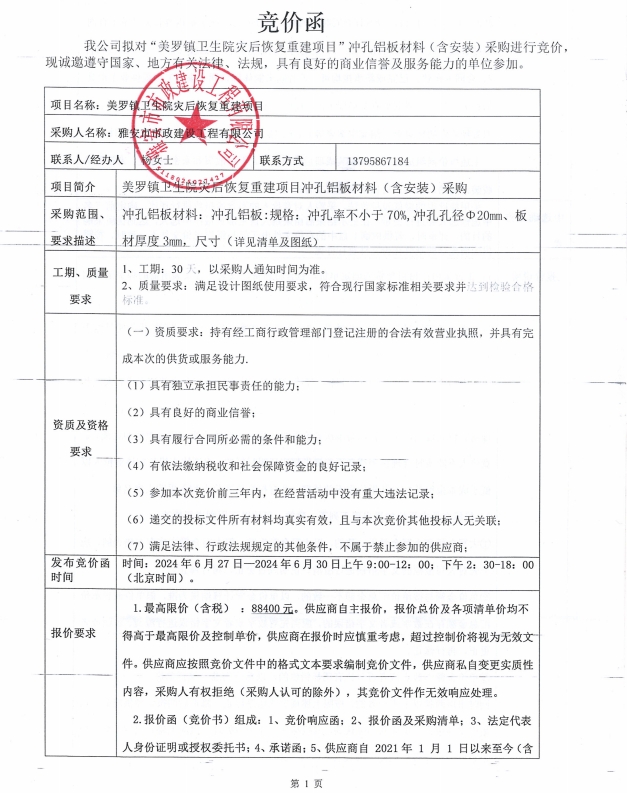 石棉縣美羅鎮(zhèn)衛(wèi)生院災(zāi)后恢復(fù)重建項目沖孔鋁板材料(含安裝)采購競價公告