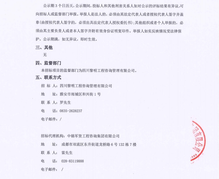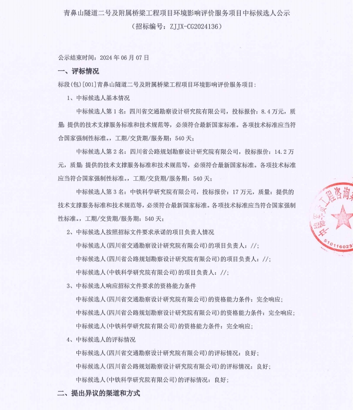 青鼻山隧道二號及附屬橋梁工程項目環(huán)境影響評價服務(wù)項目中標(biāo)候選人公示