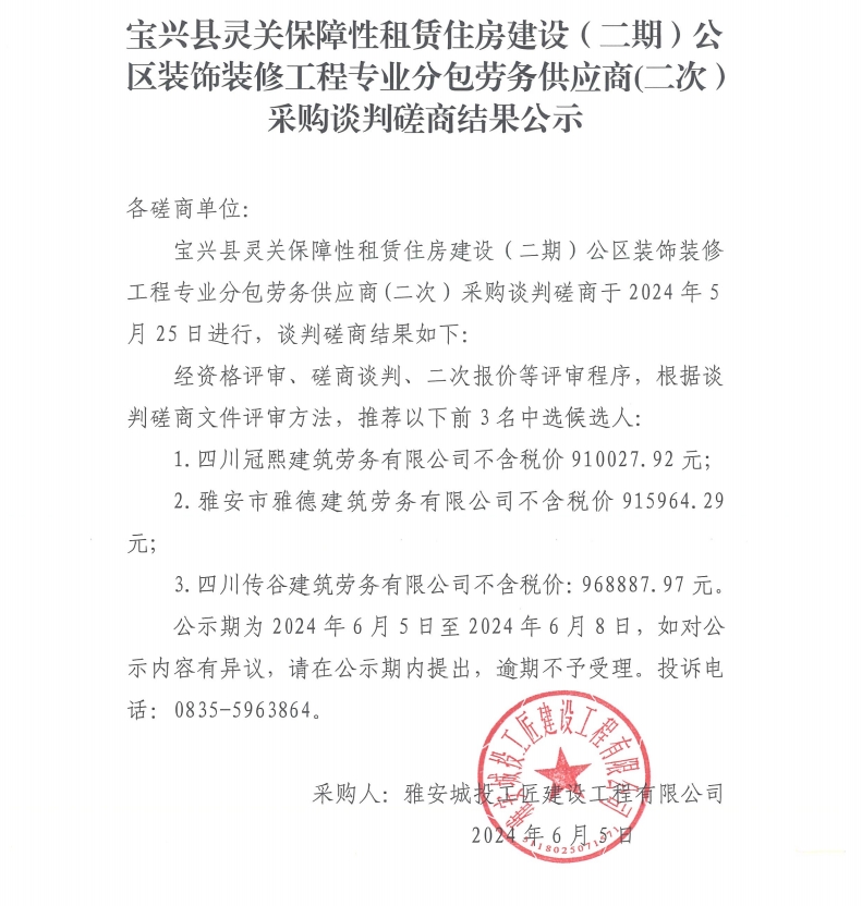 寶興縣靈關(guān)保障性租賃住房建設(二期)公區(qū)裝飾裝修工程專業(yè)分包勞務供應商(二次)采購談判磋商結(jié)果公示